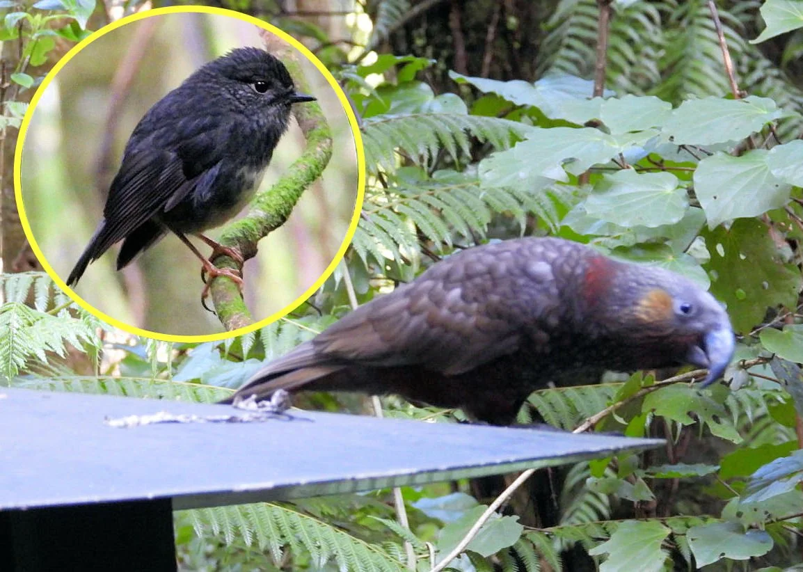 Playful kākā unself-consciously flashed their red-orange underwing as they wove around branches, drank from the trough, and even seemed to study us.