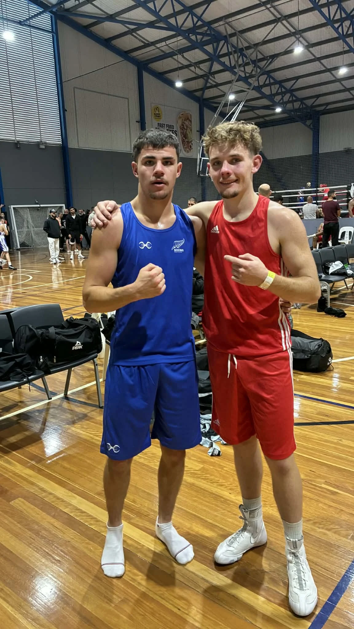 Connor Campbell (left) with his opponent after the final of the King of the Ring in Sydney last week.