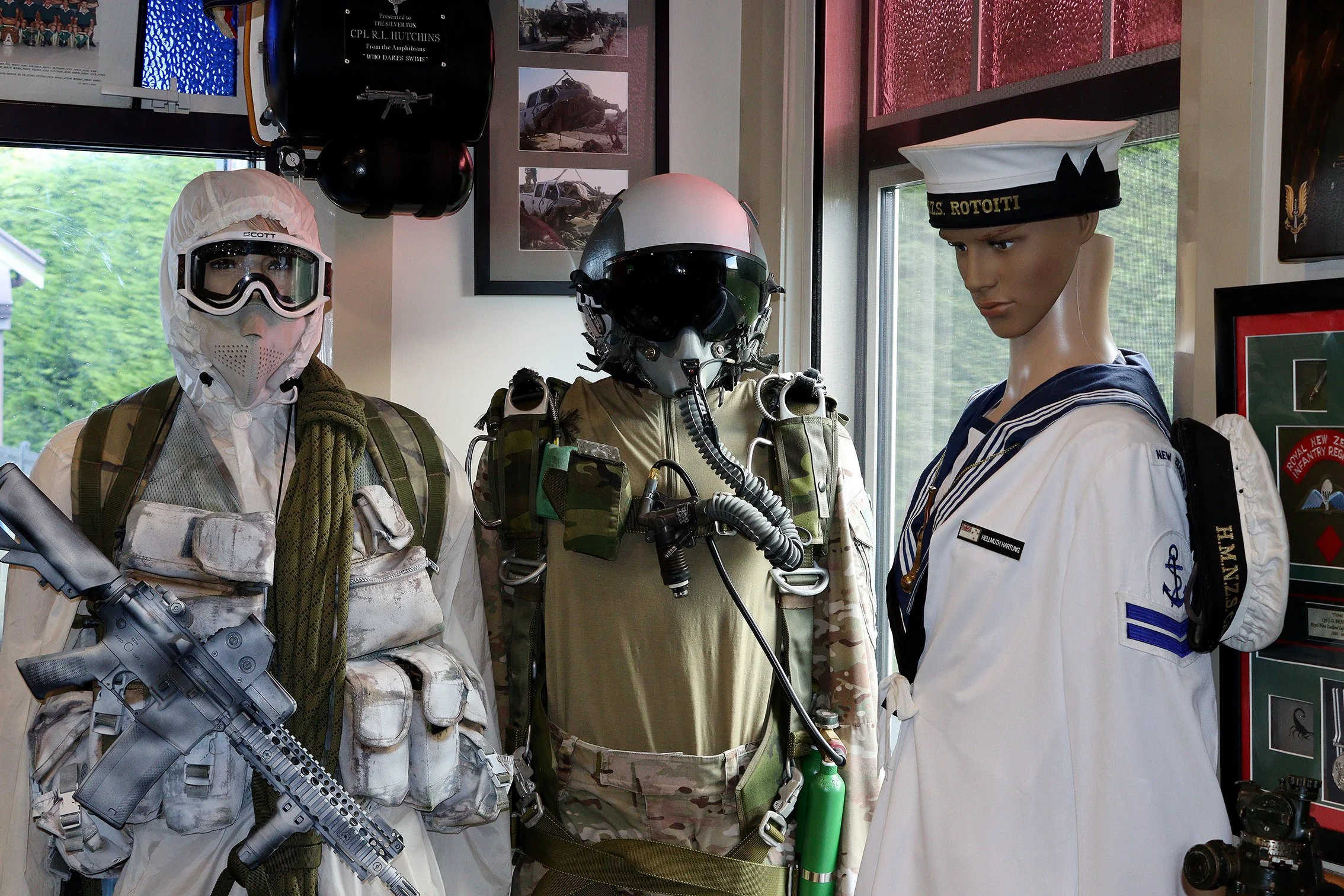 The collection spans multiple military services, though he has limited air force items. He expects to add a full air force dress uniform soon which means he will need to buy another mannequin.