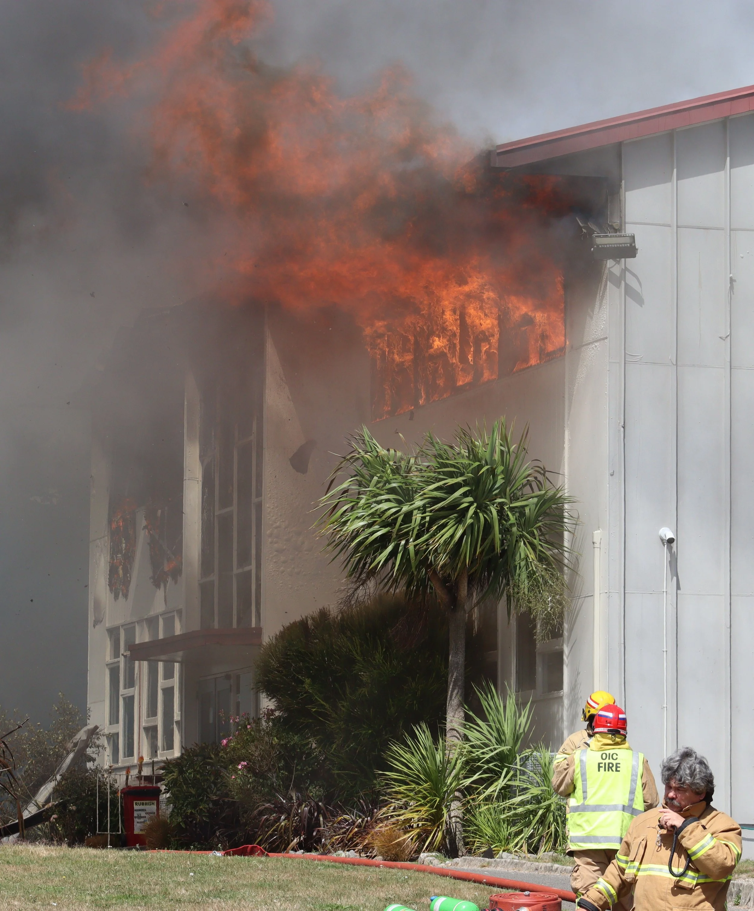 After the first ladder-truck - called an 'aerial' - from Rotorua broke down as it set up the hose on its boom, another large ladder-truck was rushed in from Hamilton almost two hours away.